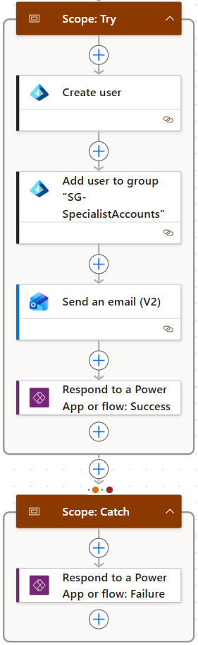 The Power Automate flow performs the actions in Microsoft Entra ID. The following screenshot shows the main part of the flow with the Try/Catch scopes.