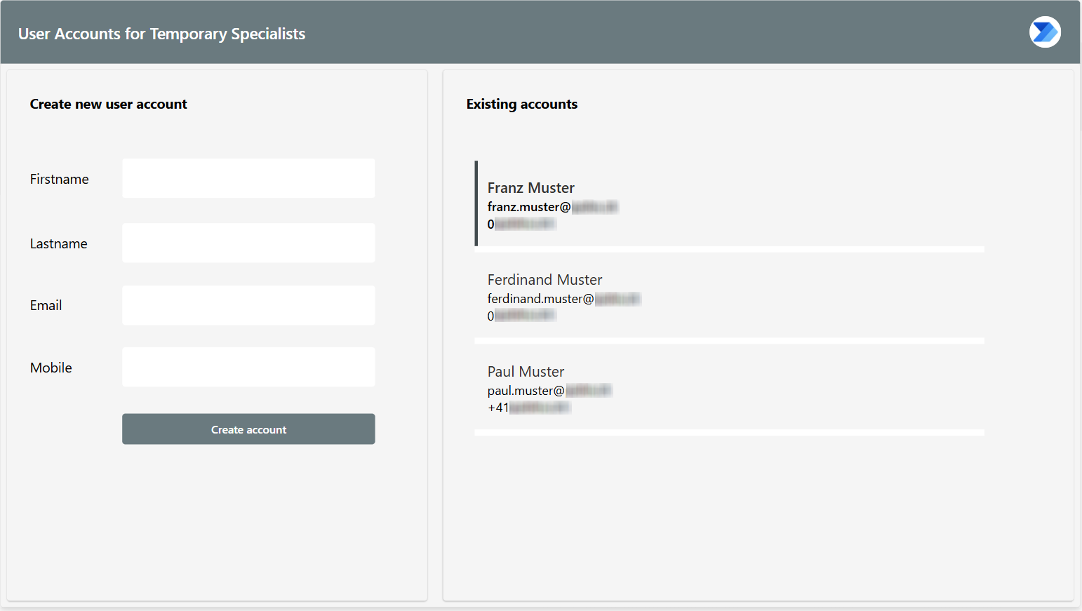 The Canvas App is used to enter the information required for the new Specialist account. The operator provides the first name, last name, a mobile number, and an external email address. The app also shows existing Specialist accounts to provide a quick overview.